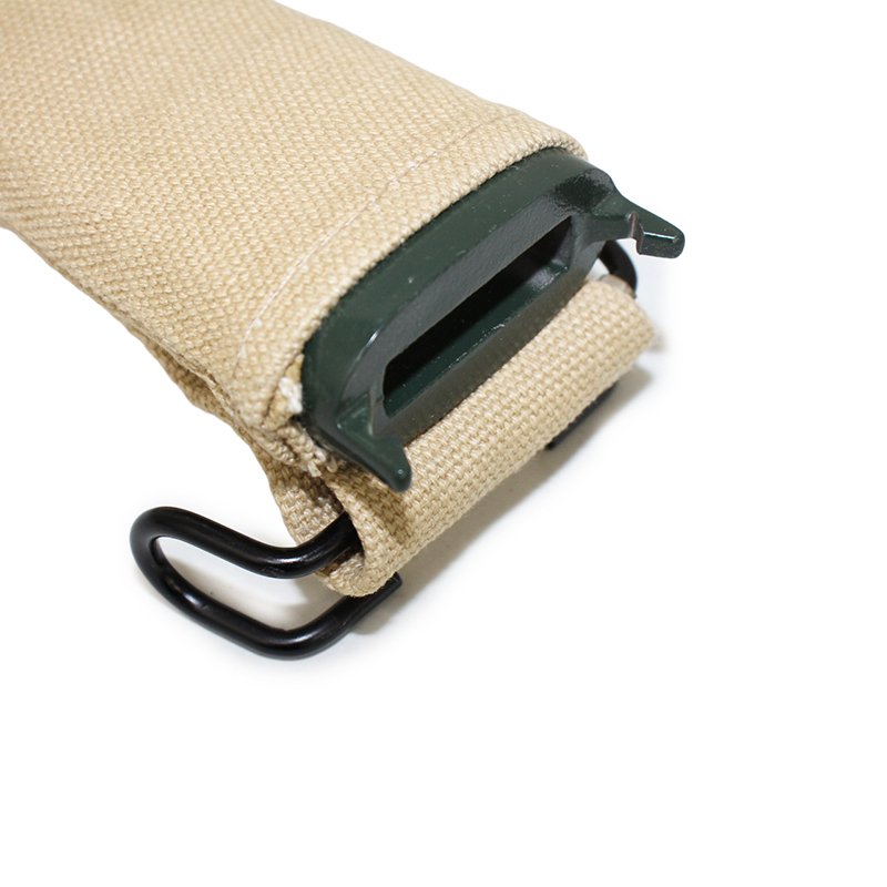 The M1910 scabbard was covered in canvas with a leather tip to prevent the blade tip from tearing the material. A wire hook that engaged grommets on the cartridge belt replaced the belt-hanger. The M1910 scabbard was the primary scabbard used during the World War I.