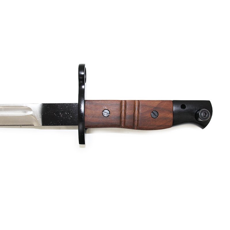 Perfect for your P14, P17 or shotgun with ventilated heat shield & bayonet lug. Steel blade with wood grips coupled with leather scabbard. Has metal tip and throat as used in WWI. Blade is made of 8Cr14MoV steel and approximately 17" long with a honed edge. These are new manufacture with markings on ricasso and scabbard.