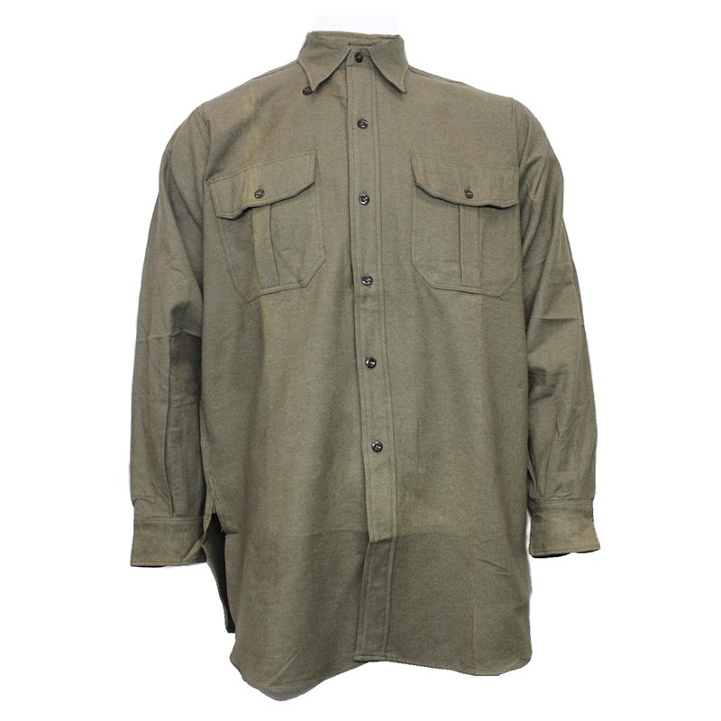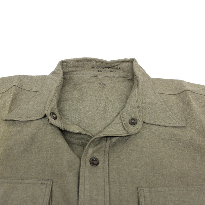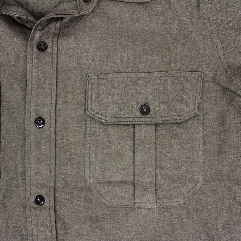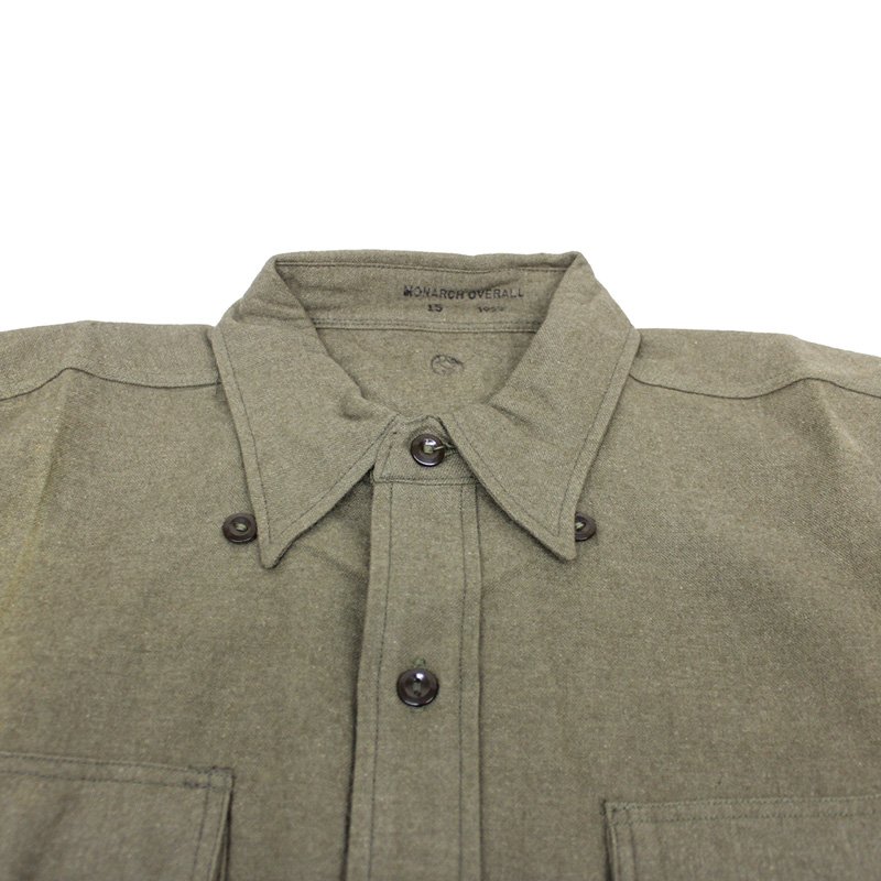 These 1950's Canadian wool flannel shirts haver a 6 button front and a button on the sleeves to allow for the sleeves to be secured when rolled up. They also have additional buttons to button the collar open.