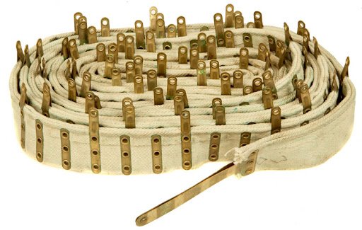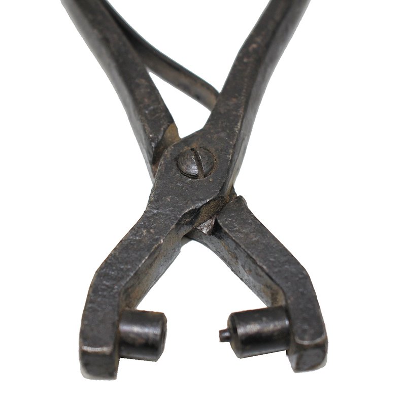 For most of its life the Vickers gun used fabric belts reinforced with thin metal strips rivetted on. Whilst reasonably robust, there was always the possibility that the belts could become damaged in the field and so spare metal strips, rivets and a pair of pliers to set the rivets were supplied. These pliers were made of metal and had a flat spring between the handles to keep the jaws apart.
