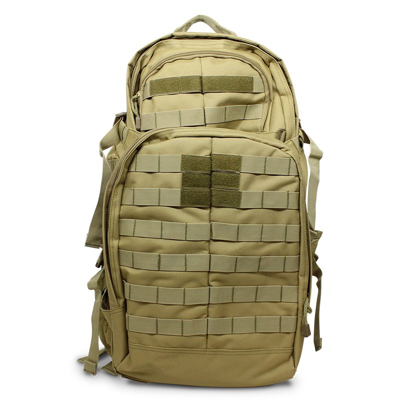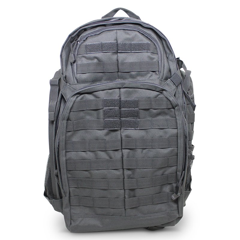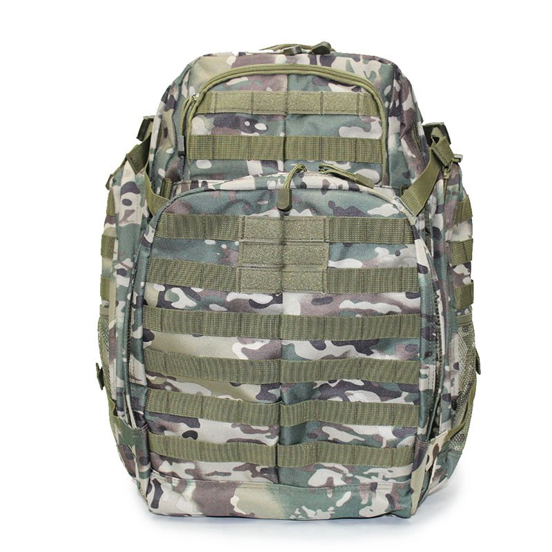 The large compartment on the front has two mesh zippered compartments, one large zippered compartment, size open pockets of various sizes and three pen holders and two clips. It also features a helmet carrier. The front and sides of the bag each feature molle for attaching additional pouches as needed or desired.