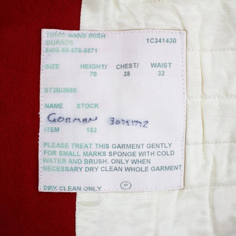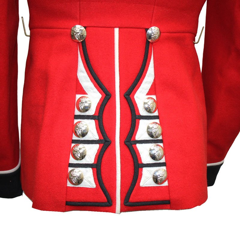 Like the other Foot Guards regiments, the "Home Service Dress" of the Irish Guards is a scarlet tunic and bearskin. Buttons are worn in fours, reflecting the regiment's position as the fourth most senior Guards regiment, and the collar is adorned with embroided shamrock.