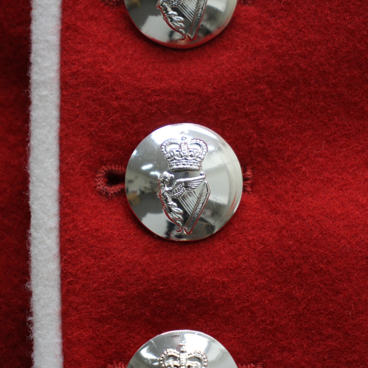 Like the other Foot Guards regiments, the "Home Service Dress" of the Irish Guards is a scarlet tunic and bearskin. Buttons are worn in fours, reflecting the regiment's position as the fourth most senior Guards regiment, and the collar is adorned with embroided shamrock.